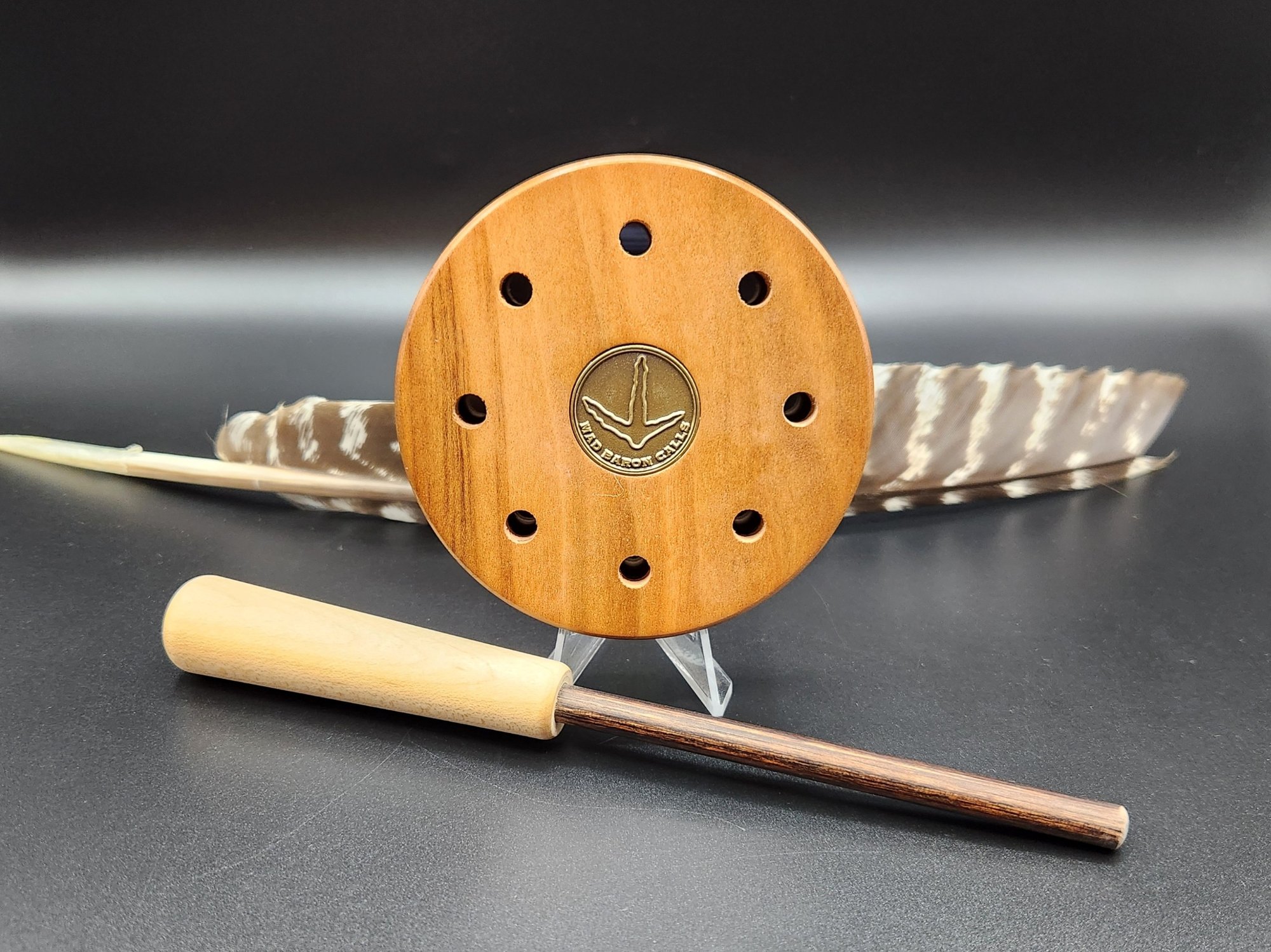 A beautiful Cherry pot call with slate surface over a glass soundboard. Cherry is one of the best domestic woods for pot calls in my opinion. Matched with a Dymondwood striker with a Maple top. Very nice call and and sounds great!