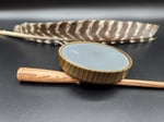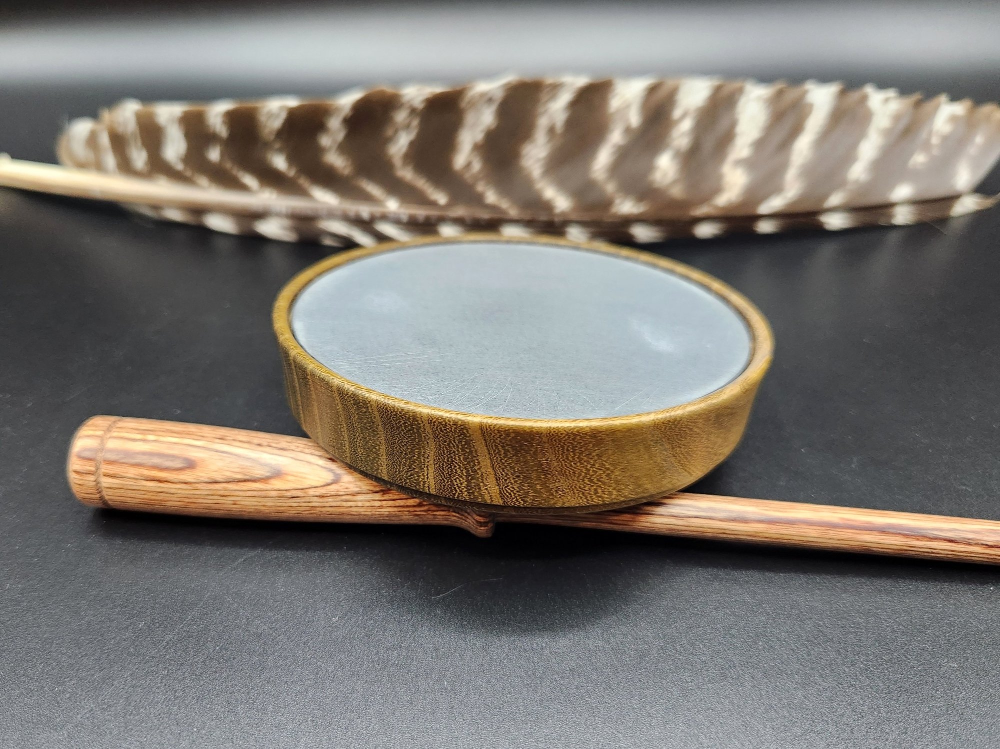 This pot call is made from mineral stained "sinker" Osage wood that was reclaimed from a river in Oklahoma. This piece of quartersawn wood is well over 150 years old and the mineral staining is natural from being submerged in mud over the decades. A slate surface over a glass soundboard. Matched with a one piece, HD laminate striker.