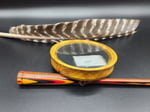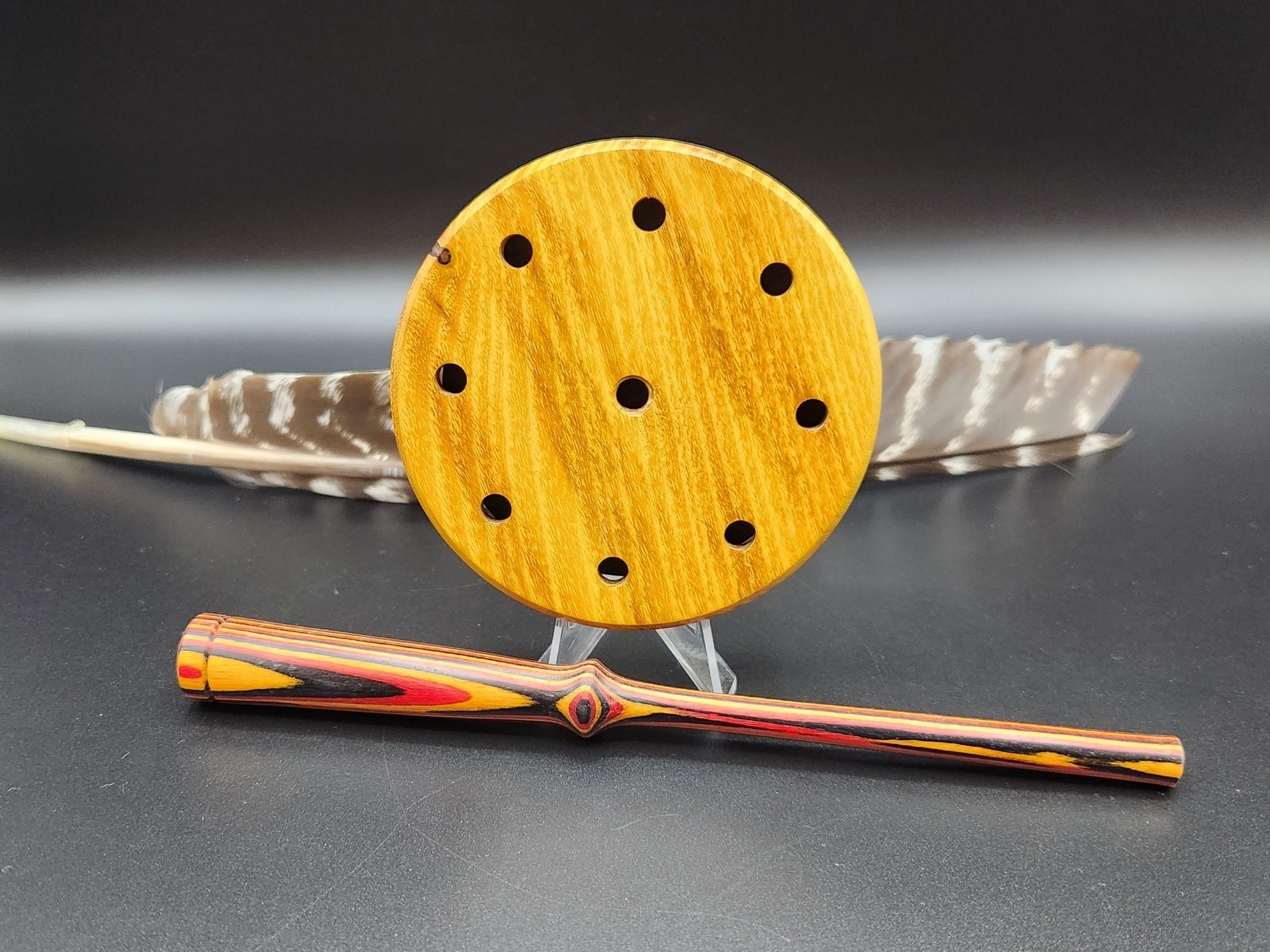 A beautiful, rift sawn, Osage wood pot call with glass surface over a slate soundboard. Matched with a one piece, hand turned, HD laminate striker that is multi colored. This is a very hard and dense piece of Osage that made a wonderful sounding pot call. Ready to hunt or admire!