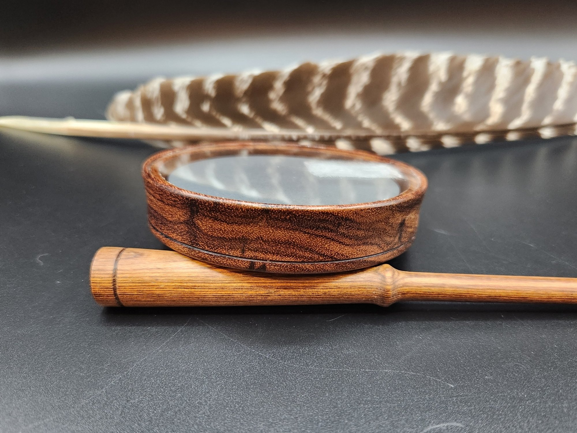 This is a great pot call made from Patagonian Rosewood with glass calling surface over a grey slate soundboard. This call is matched with a 1 pc. HD laminate striker. This is a high quality call with a lot of attention on the fine details. Great sounding call ready to hunt or add to your collection!